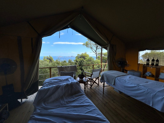 Luke 精心照顾我,提供清凉饮料,然后享受 Tasmin 提供的“超凡脱俗”芳香疗法按摩,Tasmin 拥有神奇的天赋,能够准确感知到哪些部位的紧张需要轻轻缓解,从时尚的 Safari 风格治疗帐篷中俯瞰海湾,我离开时感到非常放松和平静。提供优质的沐浴产品和毛巾
