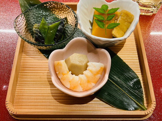 煮茄子、煮南瓜、煮虾和佐藤。