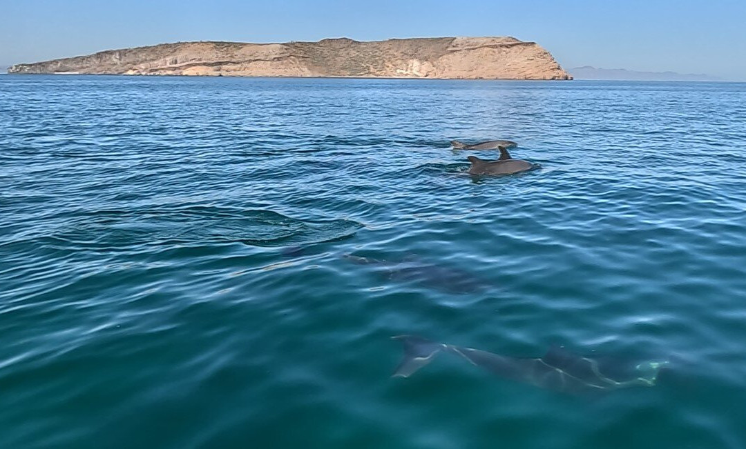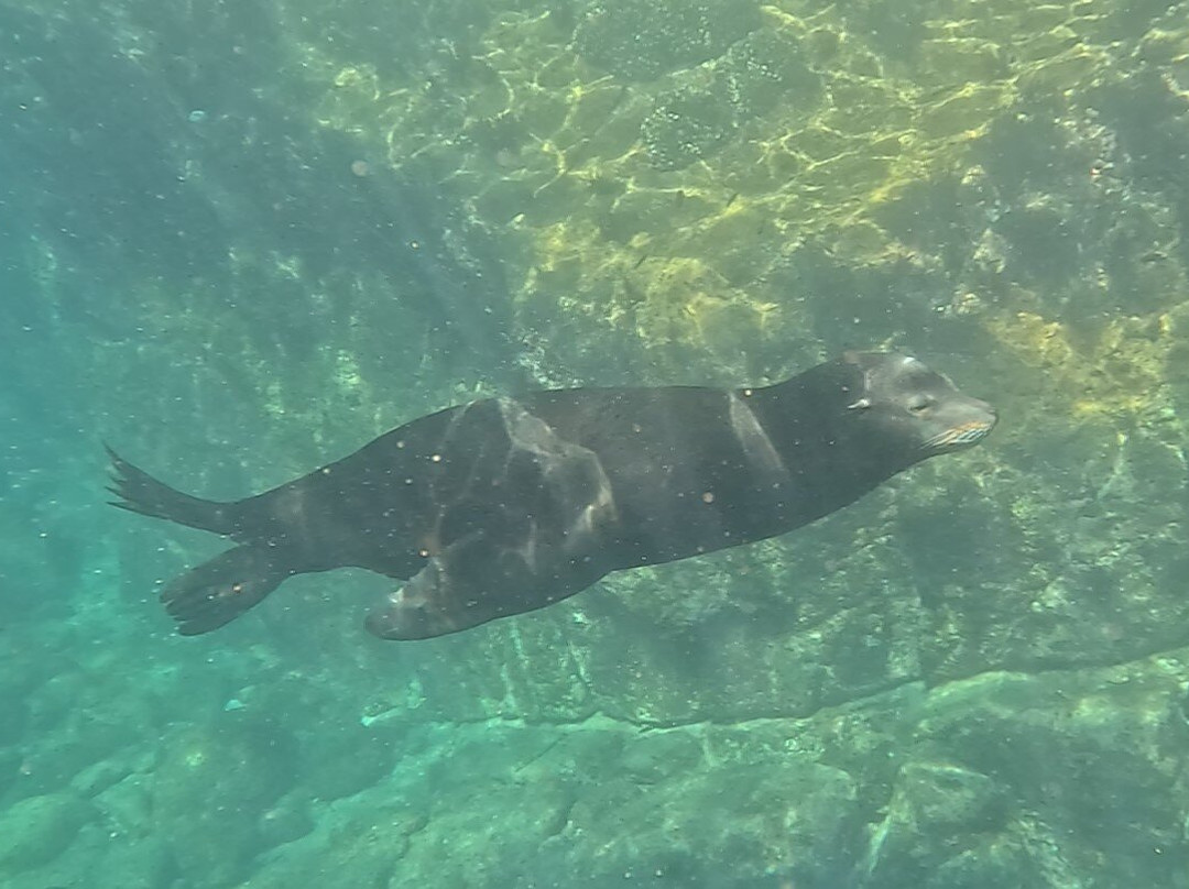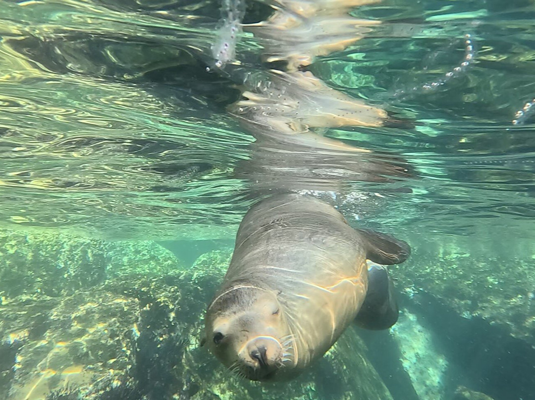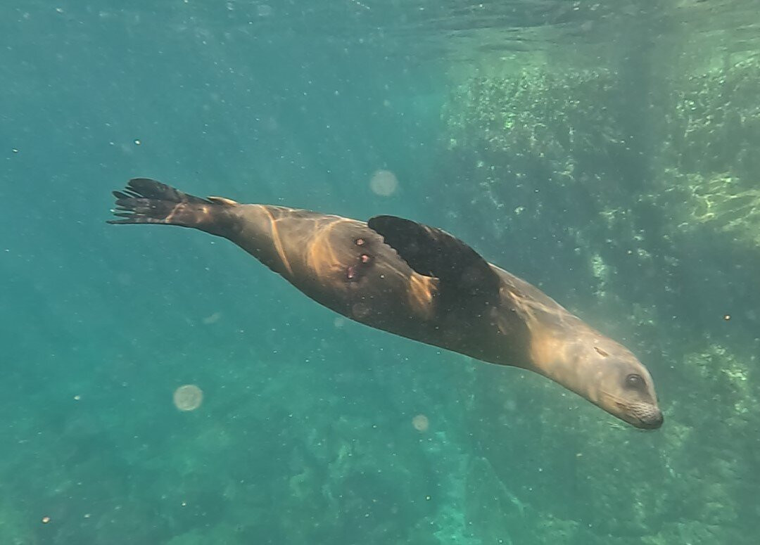 在前往海狮聚居地的路上,我们看到了海豚和蝠鲼。与海狮一起浮潜是一次很棒的经历。好奇的小家伙们非常可爱!