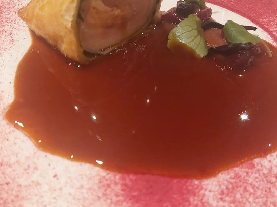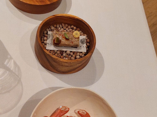 El menú está muy bien elaborado y pensado. Hacen una fusión País Vasco - Ecuador - La Rioja, ya que el dueño es vasco, la dueña (y esposa o novia del dueño) es ecuatoriana y el restaurante está en Logroño, así que en las tres tandas de aperitivos que sacan, primero sacan platos de País Vasco, luego de Ecuador y luego de La Rioja.