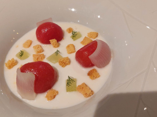 我们点了标准品尝菜单(两者中最贵的)和搭配菜单(两者中最便宜的)。我建议点搭配,因为菜单上的菜肴种类繁多,很难找到一种与所有菜肴搭配的葡萄酒(便宜的搭配就足够了,另一种只是多一种葡萄酒和更多国际葡萄酒)。
