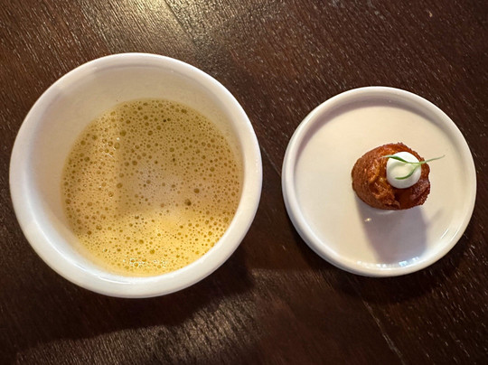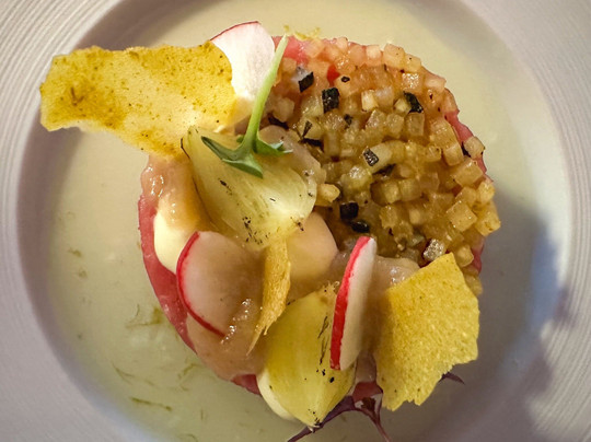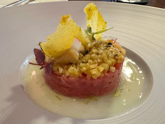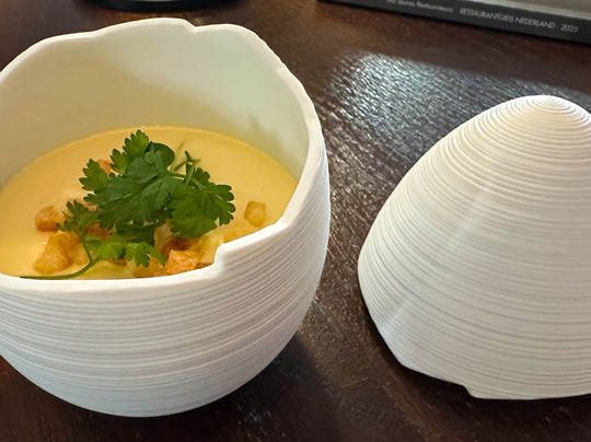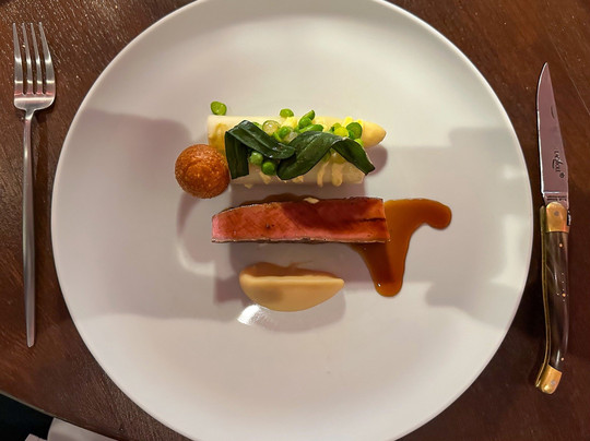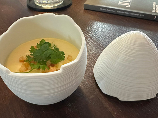 翻译:星期三晚上,步行去阿尔梅洛的一家美食餐厅。全套餐包含 5 道菜,餐前提供一杯当地起泡酒,餐后提供咖啡和法式甜点。仅有 3 张桌子有人。对于这种级别、这种性价比的餐厅来说,这实在是太少了。友好、周到且知识渊博的服务。厨房团队亲自提供一些菜肴,这很好。美味的开胃菜会让您意犹未尽。芦笋、胡椒和冬阴功汤。我们先从美味的鞑靼小牛肉开始。然后是一块美味的黑线鳕。然后是一片黄油酱鳕鱼。两片鱼都烹制得恰到好处,调味也很好。作为主菜,是一块鲜嫩美味的羊肉。盘子上摆放着各种精美的蔬菜。这道甜点由白巧克力、冰淇淋和美味的慕斯组成。如果最后还能给您提供一杯美味的双份浓缩咖啡和各种法式甜点,那么您的夜晚就不会被毁掉。再次感谢 Ledeboer 的员工,期待下次再见。