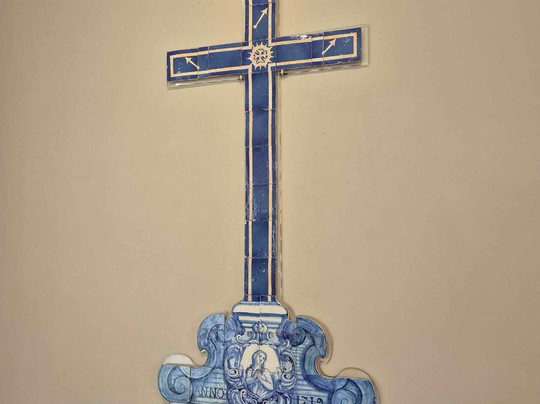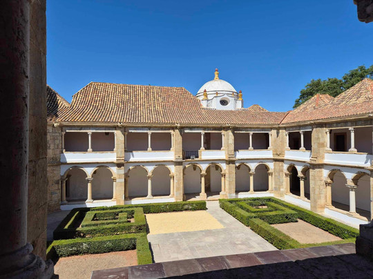 Dès le début de la visite, une superbe croix en azulejos se présente aux yeux des visiteurs. Elle date du XVIIIe siècle. La visite se poursuit dans le cloître. Quelques amphores de taille impressionnante sont présentées. On peut admirer le somptueux dôme blanc dominé par des sortes d’acrotères sous forme de flammes. Les arcs sont simples, les murs blancs bien entretenus mais les clefs de voûte n’ont pas été conservées. En revanche, les gargouilles sont encore existantes. Dans une ancienne chapelle dont le plafond du chœur a conservé de magnifiques traces de polychromie se trouvait une exposition temporaire de photographies que j’ai trouvée sans intérêt, mais c’est mon avis, pas un absolu.