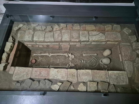 La première salle est dédiée aux objets locaux, on suit leur historique en partant de la période romaine. C’est ainsi que l’on peut s’approcher de colonnes, chapiteaux, bases, stèles… Certains vestiges sont exposés en étant complétés par leur silhouette dessinée sur les murs, afin d’en apprécier leur état original. Cela permet de se projeter intelligemment. A la fin de la salle, se trouve un sarcophage contenant un reste de squelette.