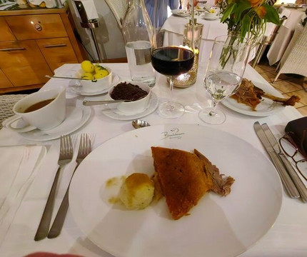 第一道主菜是鹅胸肉,配上苹果馅、红甘蓝和土豆饺子,一切都很协调,很合我的胃口。