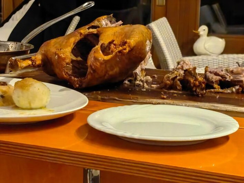 第二道主菜——鹅腿配抱子甘蓝和餐巾纸饺子——并没有让我信服。腿对我来说太干了,当我被问到的时候我也抱怨了这一点。公平地说,我不得不提的是我获得了一门新课程。由于我的食量不是很好,所以我礼貌地拒绝了。