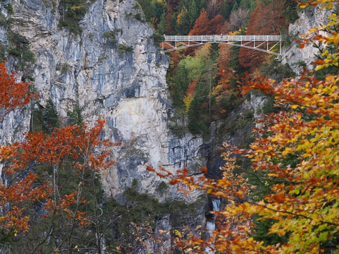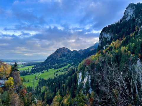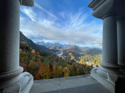 The best views were had at the end of the tour from the balcony at the end of the Palast part to the castle, looking to the west at Alpsee, Schwansee and the alpine peaks across the border in Austria. To the south was Pöllat Gorge, the waterfall and the Marienbrücke.
