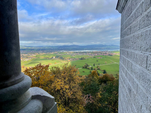 游览结束时,从宫殿部分尽头的阳台上俯瞰城堡,西望阿尔卑斯湖、施万湖和奥地利边境对面的阿尔卑斯山峰,景色最佳。南面是波拉特峡谷、瀑布和玛丽安桥。