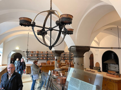 The tour experience is definitely an industrial one, yet another connection to Disney, albeit not a favorable one. And photos of the interior are strictly verboten! Frustrating for a shutterbug like me. After admittance we picked up our audio guides and proceeded through the castle, with audio prompts moving us along and castle staff reinforcing the continuous flow of visitors. They also repeat the mantra of “No photos!. The 30-minute tour takes you through just 14 rooms but these rooms were definitely a sight to behold. The original plan had apparently been for 200 rooms but only these had been completed. Of these the Throne Room was the most impressive. It was reminiscent of a Byzantine church. The strangest was the Cave or grotto, a water-filled chamber with fake stalagmites and stalactites. It once even had a small waterfall. Speaking of water features, Schloss Neuschwanstein featured then-advanced plumbing features of flowing warm/hot water and flushing toilets.