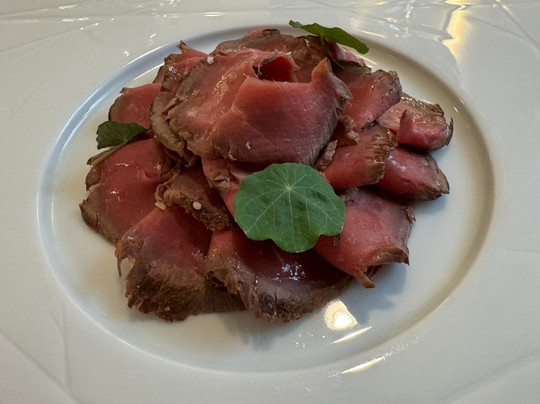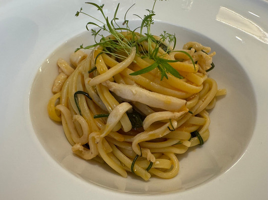 翻译:我们回到了位于 Triuggio Montemerlo 的 Gravitas 餐厅,和往常一样,这是一次美妙的体验。迎宾主菜……非常美味……他们为我们准备了“最好的”点菜菜单。鹿架配金枪鱼酱,脆皮五花肉配上葡萄干、苹果和肉桂......真是有趣的口味组合。配有鱿鱼、鲱鱼和鱼汤的扁面条以及藏红花和可可烩饭......真的很特别而且做得很精致。