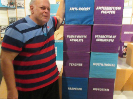 翻译:我参观了最近开放的莉莲和阿尔伯特小首都犹太博物馆。该博物馆包括阿达斯以色列犹太教堂 (Adas Israel Synagogue),该教堂建于 1876 年,是华盛顿特区第一座永久性犹太祈祷堂。该建筑曾三次搬迁,现在是首都犹太博物馆的一部分。这座历史悠久的犹太教堂与一座现代建筑相连,里面存放着大部分展品。它的核心展览是互动的。在其中一个部分中,您可以将小木制代币放入代表增加选民投票率的方法的容器中。说明中说,如果您是 DC 居民,请将您的代币放入 DC 居民容器中,因为您无法对这些问题进行投票!他们有政治圆顶小帽(骷髅帽)和纽扣。另一个展览展出了著名的华盛顿犹太人。一个互动展览提出了“你是谁?”的问题。你必须找到带有描述你的文字的方块,然后与它们合影。 (整个博物馆只有两个人,所以找人拍照并不容易。)
