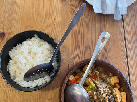 我在菜单上看到“鸡肉碗”,所以我冒险进去,立即受到了欢迎。她没有要求就立即给了我 WiFi 通行证,并提供了米饭和通常与面包一起提供的菜肴。