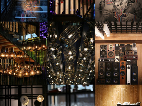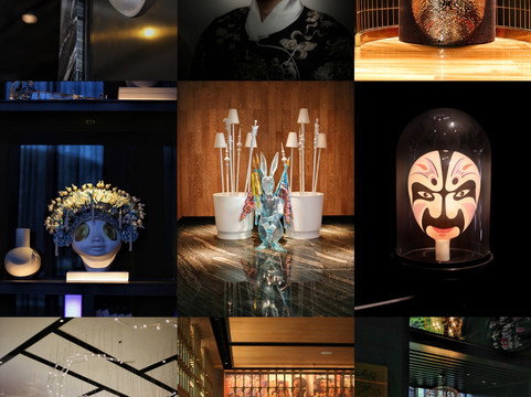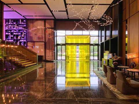 2、还没进入大堂,一个明黄色的半透明盒子就映入脸帘,大门外马赛克拼接而成的戏剧脸谱透露出浓郁艺术氛围,还没真正抵达室内就已让人眼前一亮。进入大堂,这个拥有两层挑高的空间,工业风格的木墙与丝绸质地的戏曲绘画相互碰撞,头顶的装饰吊灯,让人联想起戏曲舞台上行云流水般的翻飞长袖。大堂check in区域光影变幻,炫酷无比,夜晚的时候更显潮流魅力。这里还有一个休息区域,搁架上摆满艺术摆件,其中不乏戏曲相关的;