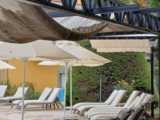We stayed at this hotel, admittedly 15 years ago, and it is sad to see it neglected. The area around the pool needs attention as there were many broken tiles and paving, some of which were sharp and dangerous. The gardens are now shabby, with neglected fruit trees. The garden and pool need to be swept and cleaned more. The sunshade of the sunbed area near the outside restaurant was filthy and had a very large pile of dead leaves on top. This could so easily have been swept off and hosed down. There did not seem to be anyone looking after the outside areas. The bar staff were friendly and worked hard. The outdoor furniture was comfortable and looked quite new. However the tables around the bar were not cleared enough. There were often dirty glasses, cups and ashtrays left on the tables. I feel they need more staff.