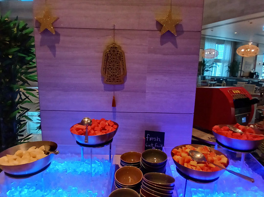 非常善意和积极响应。谢谢,Padal!餐厅在菜肴旁边贴有标示,上面标明了计算出的卡路里,也许这对某些人来说很重要!餐厅的工作人员非常好! Avnet 和 Deepanshu 不停地走到我们面前,询问我们需要带什么,并且对我们非常友好。谢谢大家! Ayana 提供沙拉、酸奶和米饼,Brigeria 提供配有香蕉奶昔的脆皮华夫饼,Mark 为我的丈夫提供煎蛋卷。煎蛋卷、咖啡、华夫饼、果汁都端到了桌子上。脏盘子会立即收走。他们会乘坐巴士带你去 Umbrella Beach,11 分钟,前台会提供毛巾。海滩上配有遮阳伞、长椅、长廊、餐饮店,但现在是斋月,咖啡馆白天都关门了。酒店附近有超市,水果和食品