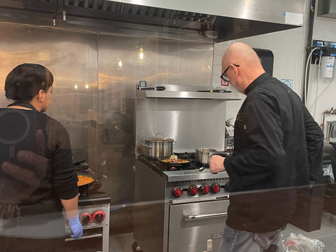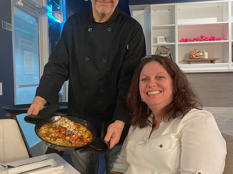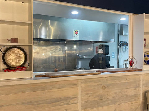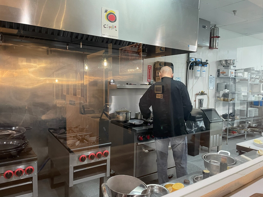 翻译:这家餐厅的老板是 Farman 大厨和他的妻子 Babette (Barbara),她也是这里的服务员。多么可爱、古雅的氛围啊!桌子上铺着精美的白色亚麻布,上面装饰着圣诞装饰(我们是在 12 月去的)。桌子上方悬挂着漂亮的灯具。墙上装饰着西班牙的照片,其中一面墙上挂着一把原声吉他。还有一个窗户,可以看到厨师准备餐点时的厨房。它距离吐温中心的拉斯维加斯大道只有一英里左右,但我们的桌子正对着球形体育场。现在,这是一家购物街上的小餐馆,里面完全不是你想象的那样……更不用说食物了!!我以前从未尝过正宗的西班牙菜。当我们在 TripAdvisor 上选择餐厅时,我甚至不得不让我的姐姐向我描述它到底是什么。这是我第一次吃鱿鱼、肌肉和鱿鱼。我确实喜欢尝试新事物,而这对我来说就是一场新事物的旋风!这些是价格低得令人难以置信的美食晚餐!如果您预订了,厨师会从厨房出来并叫出您的名字欢迎您!我们实际上交了朋友,并提前 24 小时预订了晚餐,安排了另一次访问。这样,您可以获得更大的菜单。我们的厨师还快速载我们去了 Sphere,The Eagle 的音乐会正在那里开始,因为他认为两位女士走路不安全。现在,服务怎么样?这两个人是我见过的最友善的人!你可以看出他们热爱自己的工作!