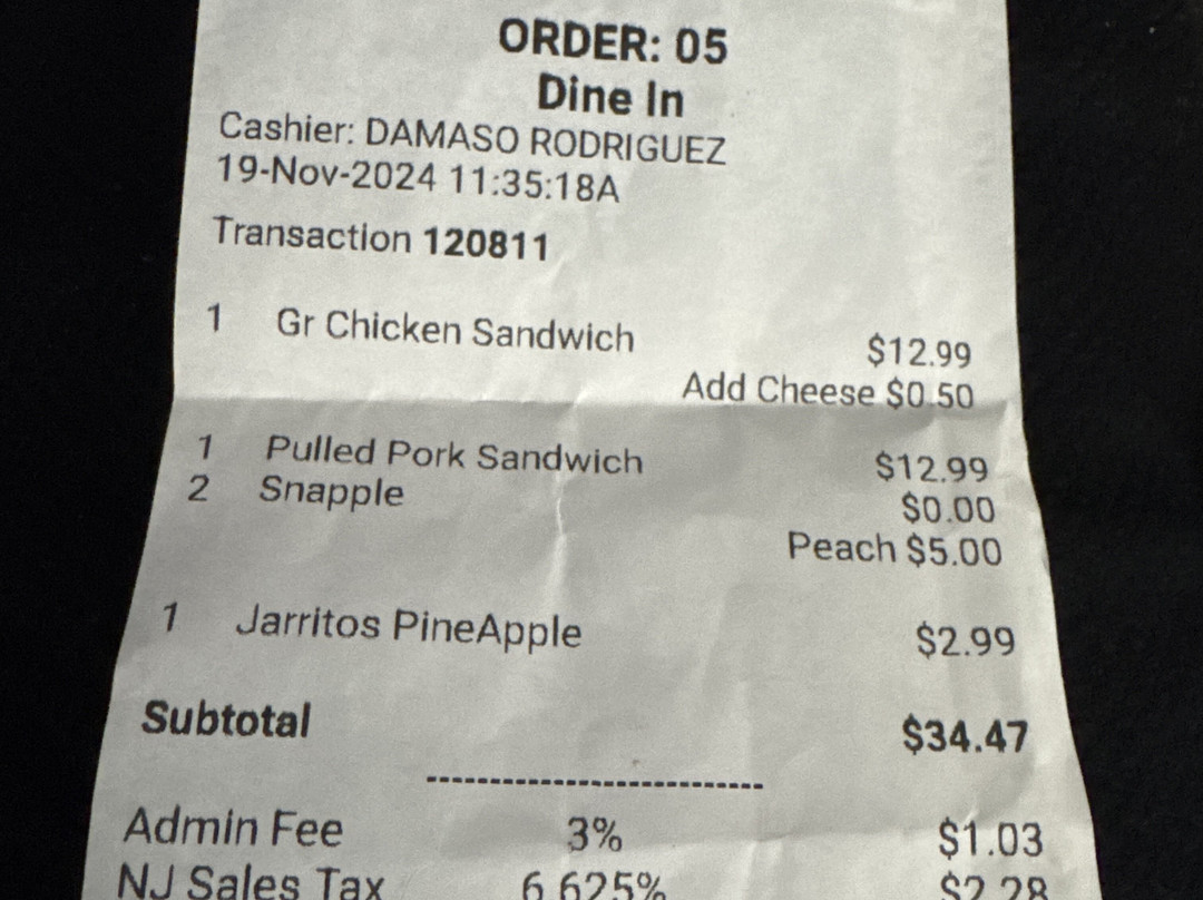 翻译:这个地方简直就是坑人。我们点了 2 个 12.99 美元的三明治,根本不值这个价钱。然后他们收了 5 美元的 Snapple 小杯饮料和 2.99 美元的 Snapple 小瓶苏打水。如果这还不够糟糕的话,他们还收取了 1.03 美元的管理费和 6.20 美元的自动小费,税率为 18% + 新泽西州销售税。我有没有提到,他们为我妻子的三明治上的一片奶酪额外收了 0.50 美元。实际上,除了自动小费外,我们还给了他们另一笔小费,这是我的错,因为我没有看收据。这不是一家高档餐厅。现在我知道为什么午餐时间这里空无一人了。这个地方在哈肯萨克医院的街对面。显然我不知道医院里没有人去那里。我知道他们还有两家分店,一家在林德赫斯特,一家在科尔尼。帮自己一个忙,省点钱去别的地方吧。这家餐厅绝对不值这个价钱,而且三明治的价格还很低!