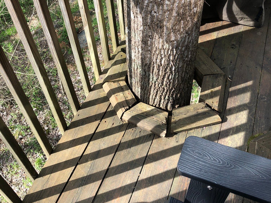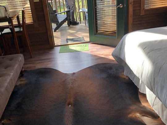 翻译:我们来镇上是为了自驾Skyway,在最后一刻决定在这里住一晚。我们很幸运地订到了Rivers Edge Treehouse Resort的最后一间房。入住手续是自助的,非常简单。房间和网上图片一样漂亮,而且超级干净。房间里有一台大电视、沙发/日式床垫、餐桌、迷你咖啡壶、微波炉和一个可以免费使用的空冰箱。特大号床配有Tempur-pedic床垫和非常舒适的床单。毛巾充足,洗漱用品香味宜人,水压也很棒。露台很漂亮,有串灯和燃气烧烤炉。两棵树从露台和室外的屋檐上长出来!有一条通往河岸的带灯小路,还有一片可以生篝火、玩马蹄铁和玉米洞的地方,还有一张滑翔机长椅。真是太美了。唯一不方便的是,只有两袋中等大小的脱咖啡因咖啡粉(没有茶包),没有勺子,也没有关于往迷你咖啡壶里加多少咖啡粉的说明,也没有瓶装水。房子在街上,闻起来像是井水,有明显的硫磺味,所以如果有新鲜的水来煮咖啡就更好了。所以,在水和不得不猜测要用多少脱咖啡因咖啡粉之间,咖啡喝起来有点不尽如人意,但那只是小事一桩。如果他们有一台 Keurig 咖啡机和咖啡包就好了。总之,我们非常期待秋天再次造访。我已经把这里推荐给了一位即将要来这里的亲戚。顺便说一句,我们住的那天晚上有龙卷风警报和一场强风暴……房子在晃动,但我们感觉很安全——这些房子很坚固!