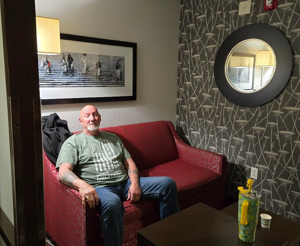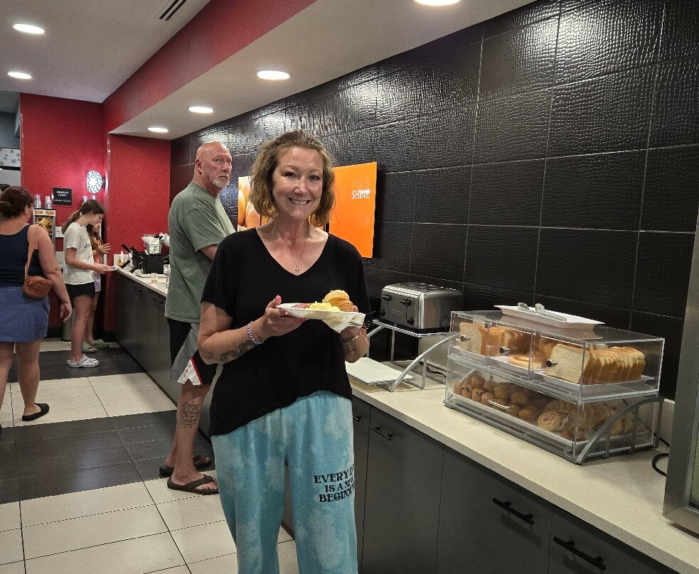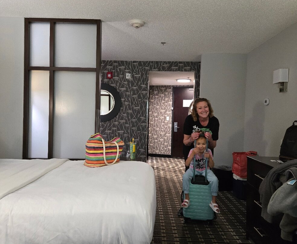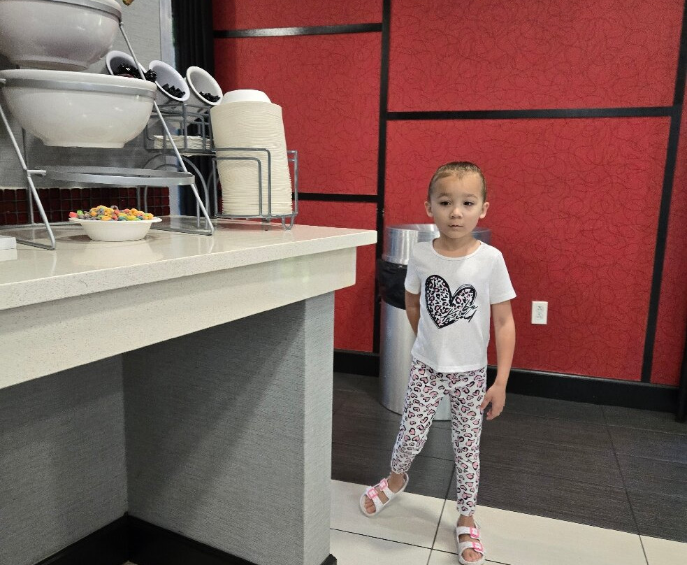 翻译:周日抵达,两层楼的大堂气味宜人,非常现代化,前台服务也很棒,员工也很热情友好。房间就在一楼最前面的两间,就在大堂旁边。大堂里就有新鲜的柠檬冰水和超市。大堂另一边的早餐区很宽敞。热早餐种类繁多,应有尽有。贝果、吐司、奶油奶酪、果冻、糕点、松饼。我们住了两晚,他们提供炒鸡蛋、香肠、切片烟熏香肠、饼干、肉汁、两种华夫饼和三种果汁。24小时咖啡供应。食物是不错的免费酒店餐食。别指望米其林星级。两层楼都有冰块。干净的蓝色灯光照射下,泳池很大,还有大型加热按摩浴缸。泳池毛巾很多,有座椅、椅子和躺椅。泳池深3-5英尺,四周环绕着带出口的窗户。开放时间:早上6点至晚上11点。套房非常放松舒适,灯光明亮,地毯干净整洁。衣柜很大。床和枕头都很棒。真希望我能把床和枕头带回家。墙上的空调温度控制方便,效果很好。有很多免费停车位。酒店很安静,主要是家庭住户。