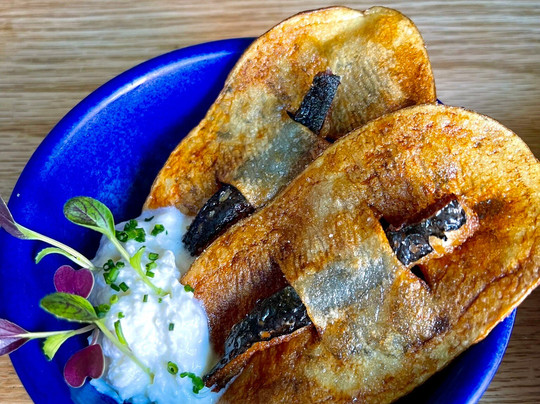 Our starters came out together- Sardines chips- was unique and very good. I don't eat horse radish but I definitely ate the one they had it was light and good.