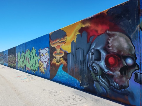 (c) The road along the flood wall is plagued by significant potholes and garbage that threaten vehicles. Whoever gets picked to drive your group there should plan on keeping their eyes on the road, not on the art. (But you'll want to get out of the car anyway to effectively appreciate the art.)