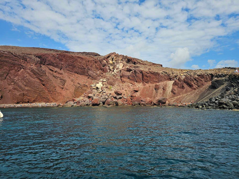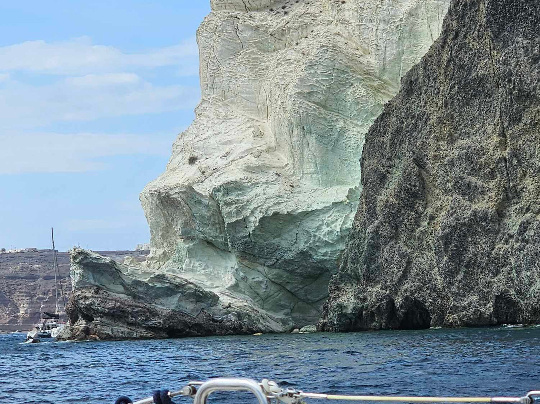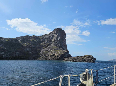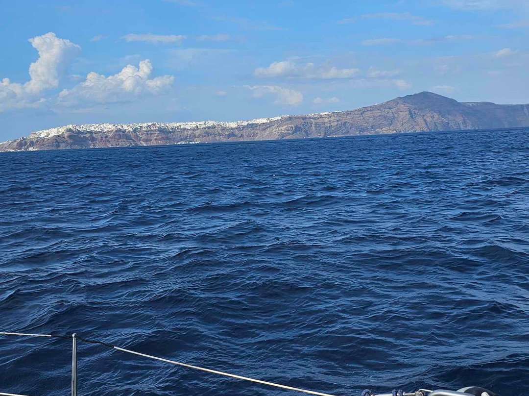 翻译:在圣托里尼火山湾航行是一种很棒的体验。如果有一位受过良好教育的船长陪伴,那就更好了。他不仅精通航海,还了解圣托里尼岛的历史、地质和发展。乔治(船长)确保我们在火山口的航行令人着迷!!那天开始刮风,但乔治确保我们不会感到不舒服,因为他用完美的技能安全地航行。解释了整个火山喷发过程,以及岛屿最终形成我们今天所见的形态。他带领我们穿过火山到达锡拉夏岛,在那里我们玩得很开心,游了很多泳。那时海面很平静,“他的”鱼可以靠近我们一起游泳 🙂 当我们返回港口时,乔治最后一次停下来,从一个僻静的地方欣赏日落,不会被其他船只打扰。所以,我们有机会尽情欣赏它!