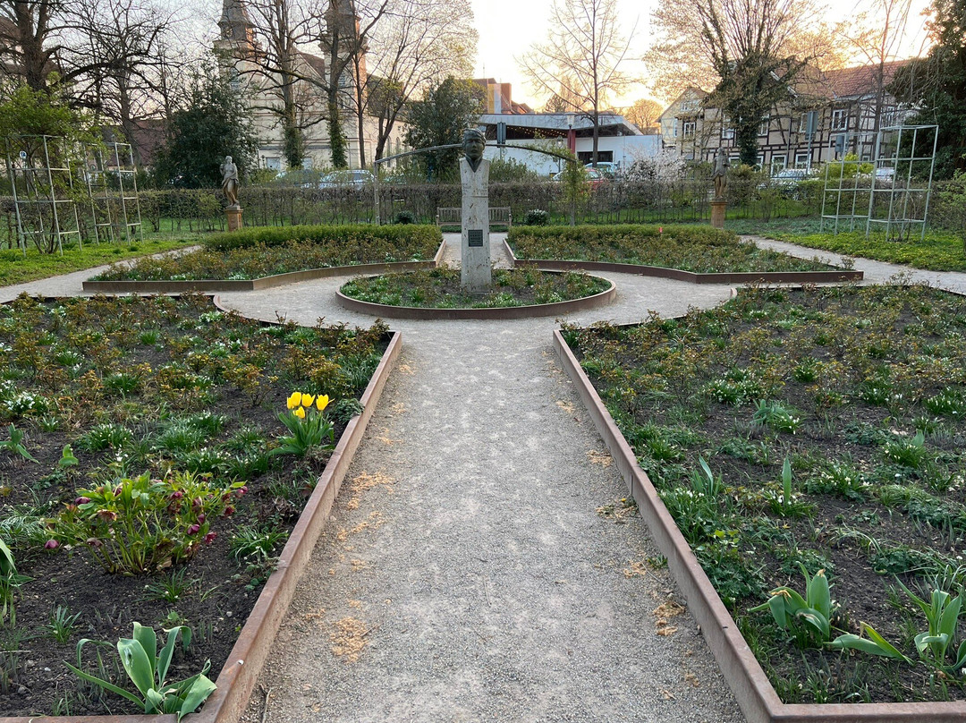 There are many points of interest in the park. Near the east entrance is a memorial to the Danish queen Caroline Mathilda, who was exiled to Celle Castle in 1772. The Celle poet Ernst Schulze (1789 - 1817) has a bust with a plaque on a marble column in the center of the Baroque rose garden just north of the pond at the eastern edge of the park. There is also a memorial to those who fought in the Battle of Langensalza (June 27, 1866) during the Austro-Prussian War. Finally, there is an art piece by Timm Ulrichs of a giant-sized flowerpot constructed around a large tree.