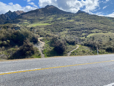Er staat in Google Maps een parkeerplaats aangegeven. Deze is erg klein. Als je optijd bent, heb je vast plek. De parkeerplaats die je net iets eerder tegenkomt (vanaf Wanaka gereden) is groter en net zo dichtbij. Hier kun je dus net zo goed je auto of camper parkeren. Het begin stond slecht aangegeven. Je moet zoeken naar het pad. Zie de foto’s.