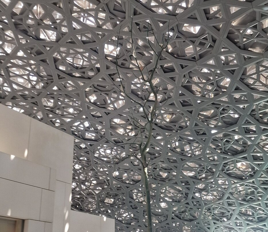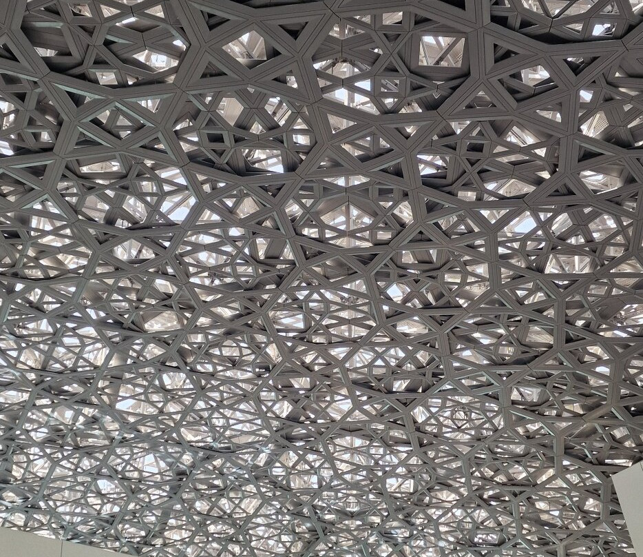 首先映入眼帘的是博物馆的建筑:由让·努维尔设计的大型几何穹顶,在建筑内外走廊营造出令人惊叹的光影效果,宛如一场真正的“光之雨”,阳光、阴影和水面交相辉映,美不胜收。整个建筑仿佛漂浮在天地之间,尤其在日落时分,更是美轮美奂。