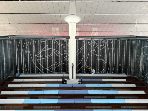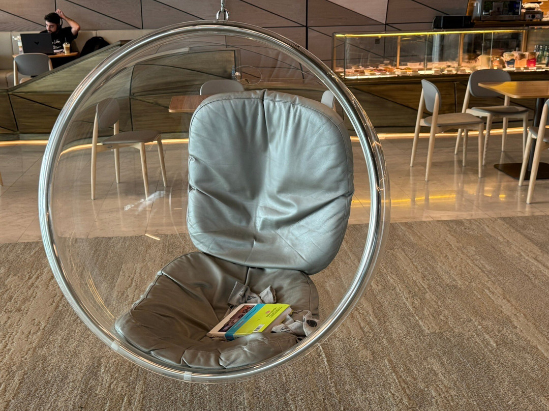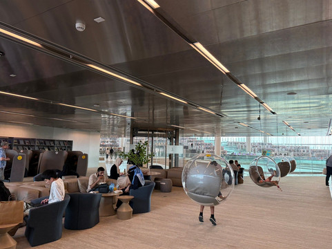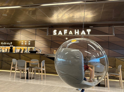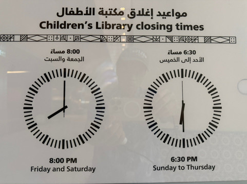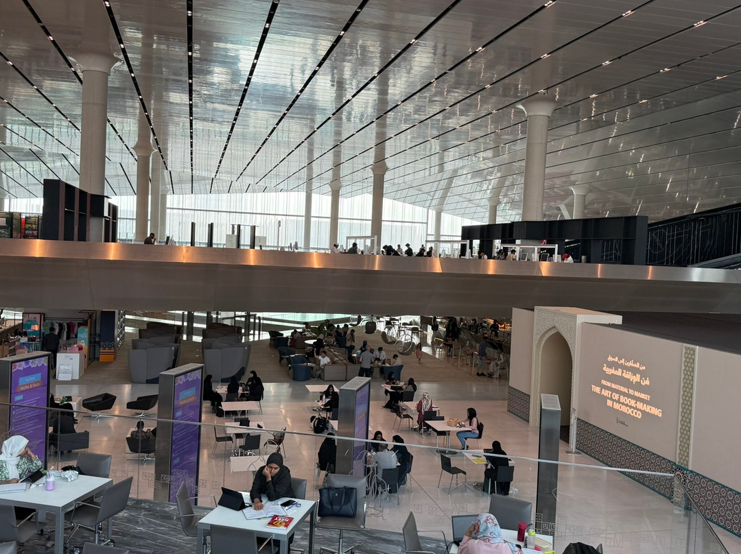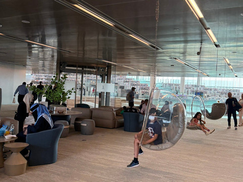 我们把舒适的小车放在自助餐厅的秋千椅前。孩子们在静静地玩耍。整个下午,我们都在欣赏和学习卡塔尔国家图书馆。在地铁高峰期之前,我们离开那里,按下雕塑石上的按钮,听男人发音第一个字母。