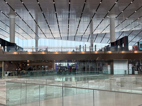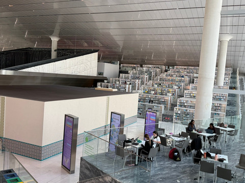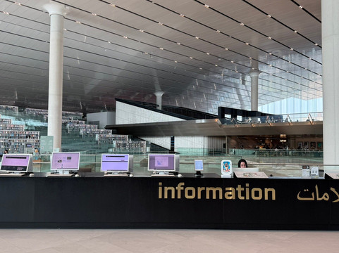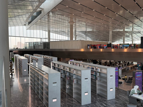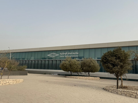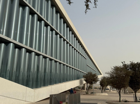 点评:Having stepped out Metro Station and walked around the building, we two seniors amazed the construction of Qatar National Library from outside. Two squares with 138-meter sides are folded and raised at one of their ends to form the main entrance into the building. A sculpture stone shows the first letter of Arabic alphabets. It is symbolized that the library is the a place of knowledge or a starting point of knowledge.