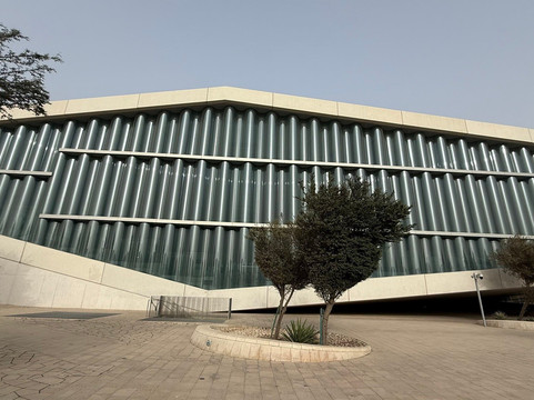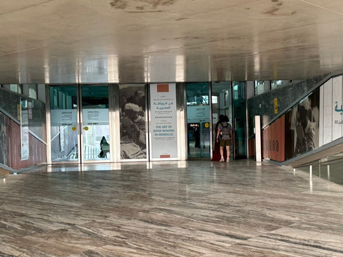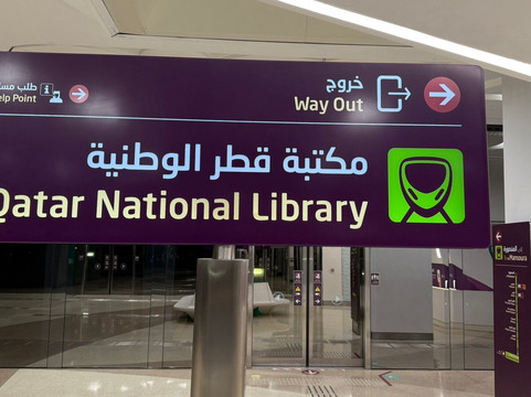 翻译:走出地铁站,绕着图书馆走了一圈,我们两位老人从外面就被卡塔尔国家图书馆的建筑结构所震撼。两个边长138米的正方形建筑,一端折叠升起,构成了图书馆的主入口。一块雕刻着阿拉伯字母首字母的石碑,象征着图书馆是知识的源泉,是知识的起点。