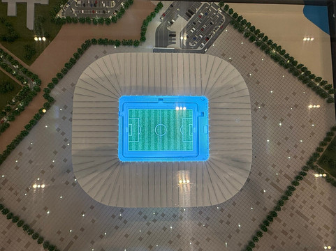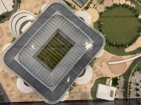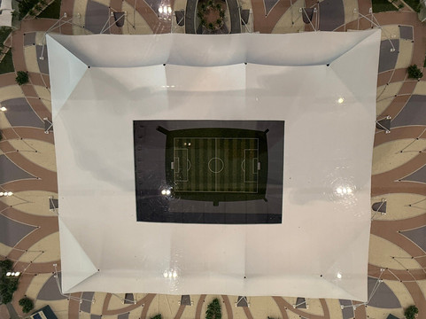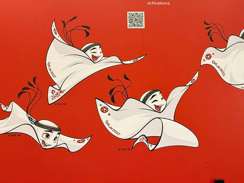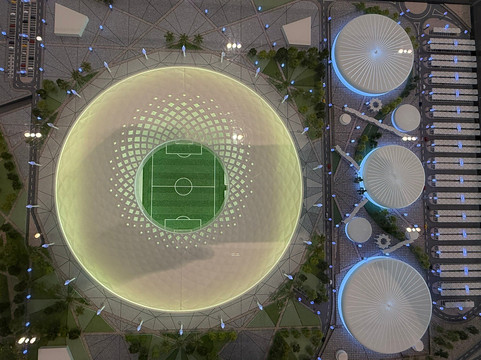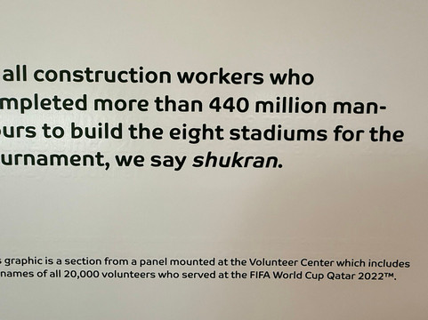 我们看到了成堆的书籍和电子书、一个演讲厅、餐厅和自助餐厅。我们还参观了卡塔尔2022年世界杯展览馆。展馆的宣传语写道:“向所有为世界杯建造了八座体育场、耗费了超过4.4亿工时的建设者们致敬,我们为此感到自豪。”