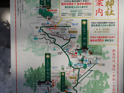 点评:痛恨の判断ミス、思い付きで中社を参拝そこまで良かったのですが、せっかくなら奥社へと来ました、ここまでも雪道で結構長く感じましたが駐車場は雪は踏み固められて全く地面は見えない状態、寒波の日だったので雪はしんしんと降って来てここで考えればよかったのですが、駐車場に看板もあったのでしょうが、登山靴も冬用も持っていたのですが夏用を履いていて履き替えるのが面倒でそれでも良いかとあまり気にしていなくて距離も駐車場から中社程度かなと着ている物もスキー用の物で暖かい状態でもあったので大丈夫かなと安易に雪の中を歩き始めました。時間的には午後3時を過ぎた位だったと思います。所が後で分かったのですが奥社まで入り口から2Km通常では徒歩40分とありましたが、この日は既に数日の寒波で雪が踏み慣らされツルツル状態、参道横は入ったら膝までずぶずぶとのめりこむ状態、ここを妻は冬の登山靴私は夏の登山靴で滑る所はゆっくり妻の手をお互いに取りながら歩くと通常の2倍以上かもっと時間が掛かります。ここも外国の方が多く、人によっては靴の簡易チェーンを付けて歩いている人がいましたが、これは必須だと思いました。これを持っていない人は、子供連れの外国人で参道は滑るので横を膝まで埋もれながら歩いている人や坂をお尻で滑りながら降りている人などがいました。結局我々は途中で薄暗くなってきたこともあり、引き返す判断をしました。これは大正解でした。駐車場に着いた時にはもう略真っ暗で携帯で道を照らすほどになっていました。2人で途中で引き返して正解だったねとしみじみ話しました。ここは雪の状態によるのかもしれませんがほぼ冬の登山装備に近い格好で行く事をお勧めします。特に雪があるときは簡易チェーンアイゼンは必須ですね。この雪が踏み固められた状態だったら普通のアイゼンでも良いのかもと思うくらいでした。しかし、雪の奥社への参拝コースは写真で見る神秘的な雰囲気が一杯で大きな大木からパワーを頂いている雰囲気が一杯の参道でした。次はしっかり装備して冬の雪の奥社に来てみたいと思いました。