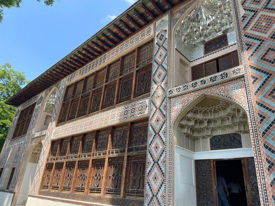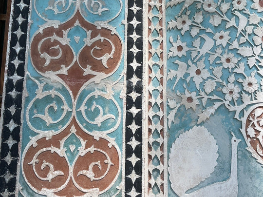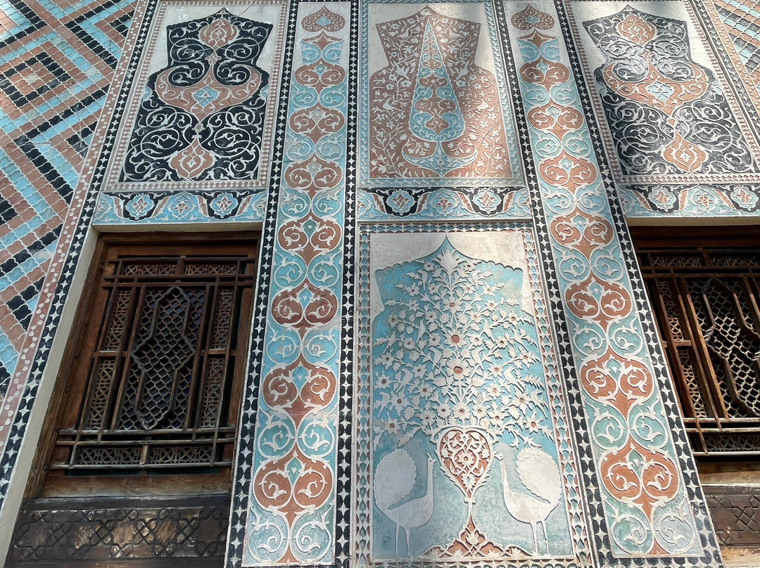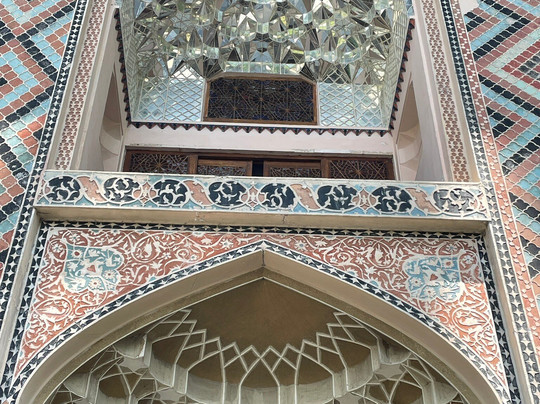 翻译:位于城市要塞内的舍基汗宫以其宏伟的壁画和色彩斑斓的马赛克窗户而独树一帜。舍基汗宫是木雕与玻璃工艺(称为“shebeke”)的完美结合。这些精美的彩色玻璃窗由数千块彩色玻璃片镶嵌在木格子中,无需钉子或胶水,营造出色彩鲜艳的马赛克图案,将五彩缤纷的光线洒满房间。壁画蕴含着深刻的寓意,需要导游才能理解,我们额外支付了10马纳特。室内房间面积虽小,但这次导览游绝对物有所值。宫殿正面绘有丰富的绘画,描绘了狩猎和战争的场景,以及复杂的几何图案和植物图案。