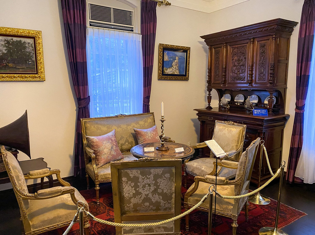 建筑内部,包括凸窗、阳光房和壁炉在内,几乎原封不动地保留了原貌,反映了当时外国人租住房屋的风格和布局。虽然部分家具陈设展现了当时的氛围,但收藏的迈森瓷器和皇家伍斯特瓷器等名贵西式瓷器却缺乏说明,无法解释其与原住户生活是否直接相关,因此这些展品的用途尚不明确。毗邻的“观景廊”于1982年作为姊妹博物馆开放。这里展出马蒂斯和郁特里罗等艺术家的现代和当代绘画作品,但这纯粹是为了吸引游客,与建筑本身似乎并无太多历史渊源。观景廊可以饱览神户市及其港口的壮丽景色,但由于由私人旅游集团运营,其主要目的似乎是为了支付建筑的维护费用,而2200日元的门票价格也略显昂贵。