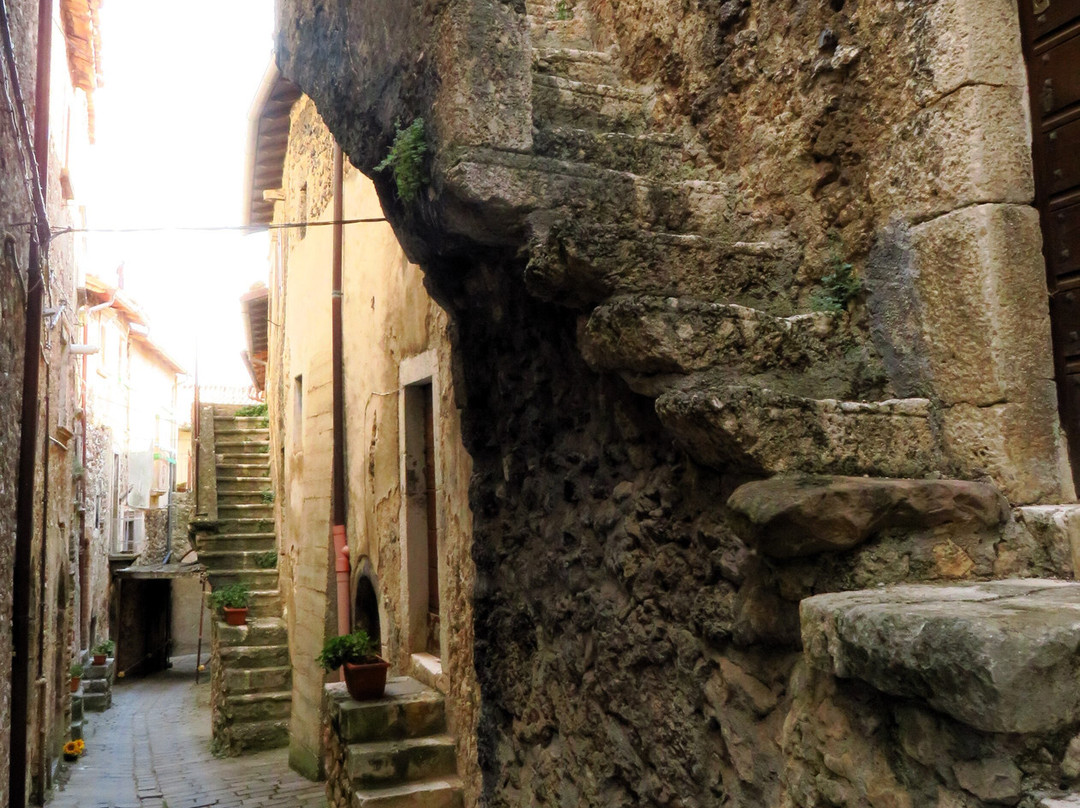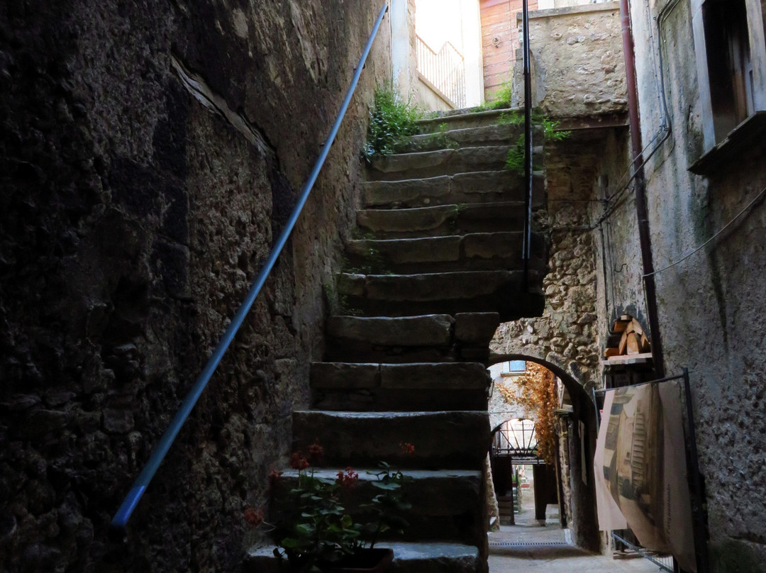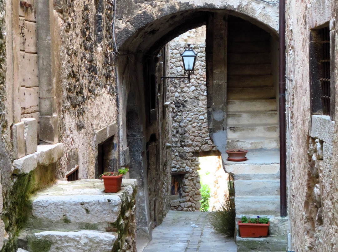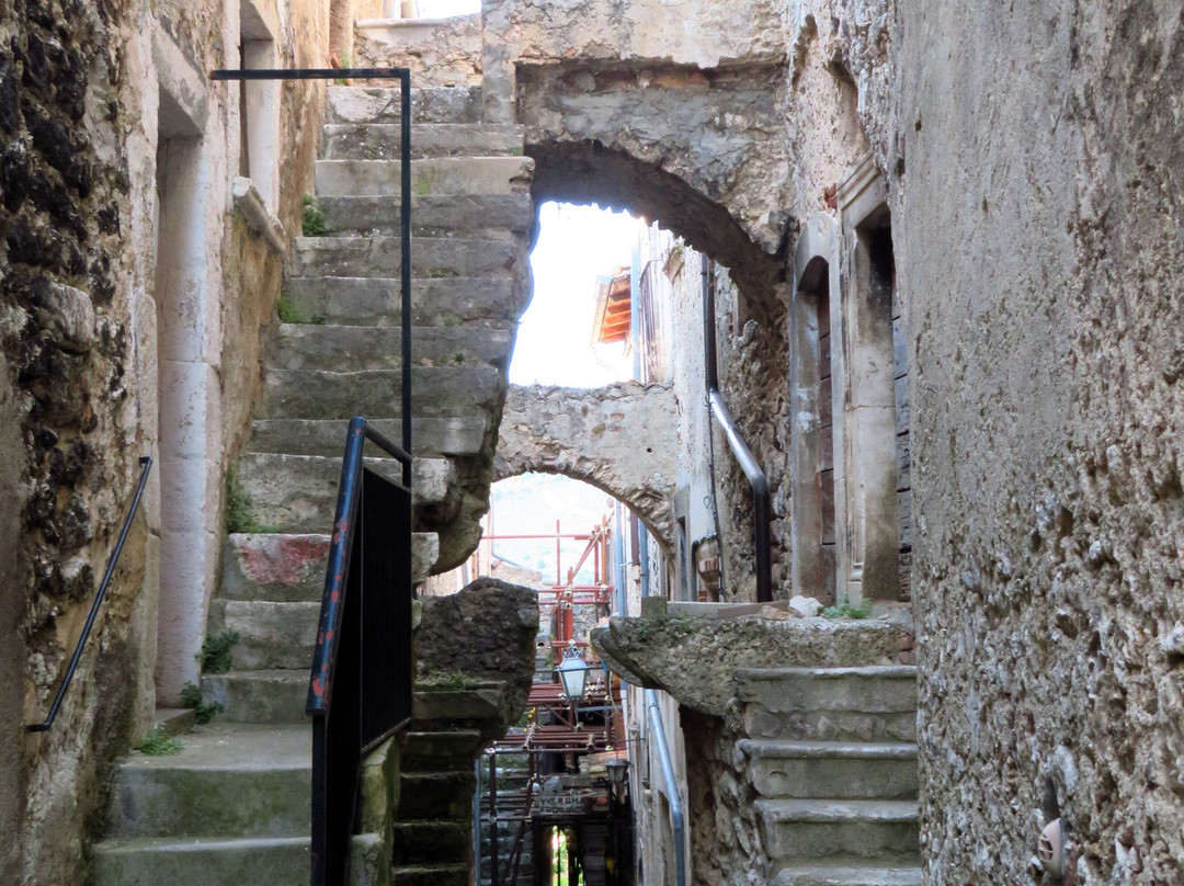 翻译:一个海拔超过1000米的小村庄,其主要特点是它的历史中心,从中世纪时代开始,但具有典型的罗马道路布局,其独特的蛋形(或椭圆形;从上面看让我想起一只乌龟) 。它显然是一个坚固的村庄,周围不是传统的城墙,而是沿着椭圆形周边的房屋墙,其中周期性突出的部分充当了望塔;除了船长宫的吊桥门(西北角)外,还有两个入口仍然存在:西边的马焦雷门和南边中央的圣马蒂诺门。从马焦雷门(Porta di Torre Maggiore)进入,您进入一个大庭院,狭窄的decumanus从这里开始,从西向东贯穿整个坚固的村庄;狭窄的小巷(cardi)从两侧的 decumanus 分支(一侧有 7 个,另一侧有 8 个)。这座中世纪小镇是在罗马城市的经典方案上发展起来的,其特点是众多的拱门和拱形通道,以及小巷两侧的许多楼梯,可到达建筑物的各个楼层:没有护栏的楼梯靠在外堡上,有台阶随着楼梯的升高,它们的宽度会增加(这是出于明显的实际原因,即允许在街道层面更容易通过);有人将所有这些楼梯比作一架无边钢琴的琴键。尽管存在人类活动的迹象(花瓶、窗户上的窗帘),但坚固的村庄似乎大部分无人居住,即使受地震影响的部分(脚手架和障碍物的存在表明)或那些明显被遗弃的部分(因为破旧不堪)与该地区的其他中心相比,建筑物和杂草植被的影响程度较小(只需前往附近的 Carapelle Calvisio 即可了解这一点)。我相信这一百多位居民中的大多数都住在设防村外的房屋里。该镇曾经甚至有 1000 名居民,但人口减少并不是 2009 年地震的直接后果,这场地震只是加剧了第二次世界大战后开始的人口下降:1950 年人口已降至 800 人,然后2009年地震前,人口已降至200人左右,20世纪70年代降至400人。除了美丽的圣马蒂诺门外,不要错过参观邻近的圣乔瓦尼巴蒂斯塔教堂和圣西普里亚诺教堂(后者位于设防村庄外,在从山谷底部升起的道路上)。