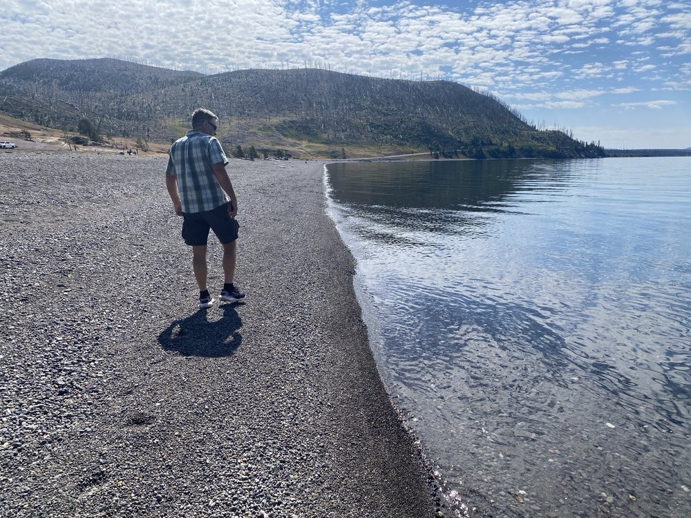 翻译:在公园的第二天,我们游览了大峡谷地区,然后发现了这个湖。那天,大概是暴风雨要来了,因为风很大,湖面上竟然起了波浪!我们几次下船,探索湖岸。我捡到了几根鸟羽,这让我很兴奋,考虑到当时的风力,它们竟然没有被吹走,真是太神奇了。在公园的第三天,我们从渔桥返回老忠实泉的路上,再次经过这个湖,眼前的景象让我们惊叹不已。湖面完全平静,宁静而温柔。我们不得不停下来再次探索,这与前一天的体验截然不同。这个湖岸真是太美了,绝对是公园里值得一游的地方。