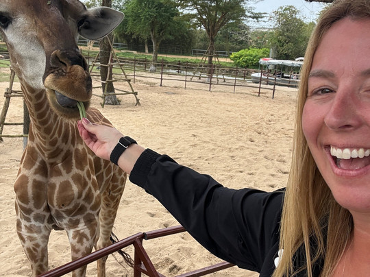 公园里很安静。我们的出租车司机很友好地带我们进去,并告诉我们去哪里买票。我妈妈60多岁了,所以带了护照,买了折扣票。公园里有婴儿车接送,但我们很乐意自己慢慢逛。妈妈一直以来的梦想就是见到长颈鹿并喂它,我们实现了!需要额外付费,我说“额外付费”是指一罐水果加一张门票19万越南盾,大约相当于5英镑。这真是太棒了!我们非常喜欢。公园里还可以喂大象。我们乘船游览了动物区。黑熊看起来很焦虑,不停地用头撞它坐着的墙壁。我们乘船游览了两次,两次都看到白虎不停地踱步。看到这一幕,我们感到非常难过。