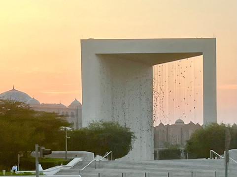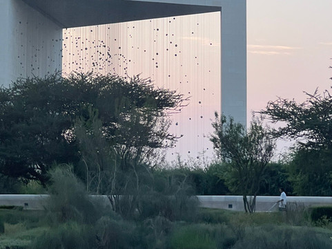 点评:В центре небольшого сада-святилища (Sanctuary Garden) 200*200 м, очень ухоженного и охраняемого, установлена инсталляция «Созвездие» (The Constellation). Это 30-метровая бетонная рама, внутри которой с определённого ракурса (и мне удалось его поймать!) различим трёхмерный портрет шейха Зайеда бин Султана Аль Нахьяну. Монументальный арт-объект – творение американского скульптура Ральфа Хелмика – открыт в 2018 г. в честь столетия основателя ОАЭ (1918-2004) как дань памяти, уважения и глубокого почтения лидеру, сыгравшему выдающуюся роль в объединении семи арабских эмиратов в единое государство в 1971-м. Уникальное произведение искусства состоит из 1327 правильных многогранников с отражающими элементами (так называемых платоновых тел), подвешенных на 1100 струнах-кабелях на разной высоте и в особом порядке. Они образуют пять объемных геометрических фигур, которые и создают то самое созвездие – 3D-портрет шейха, наиболее выразительный с вечерней подсветкой. Хотя и на закате, когда мы оказались около Founder’s Memorial, на фоне дворца и в обрамлении деревьев и кустарников (рода prosopis, по-нашему «мимозка») он смотрелся очень эффектно. Необычный и оригинальный, техничный и технологичный, эстетичный и стильный памятник.