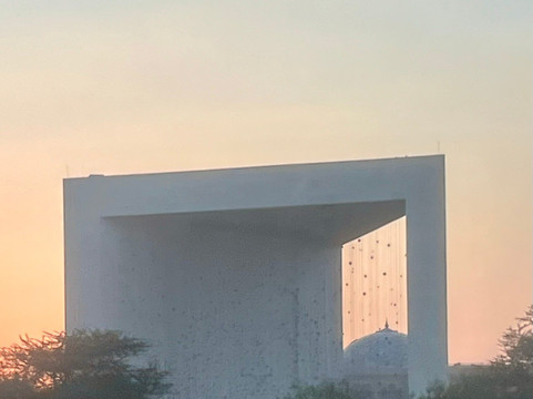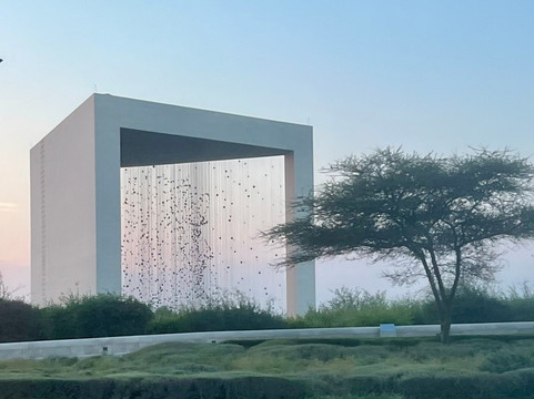 翻译:在一个维护良好、戒备森严的200x200米的小型圣殿花园中央,矗立着名为“星座”的装置艺术作品。这是一个30米高的混凝土框架,从某个角度(我设法拍到了!),框架内可以辨认出谢赫·扎耶德·本·苏丹·阿勒纳哈扬的三维肖像。这件由美国雕塑家拉尔夫·赫尔米奇创作的巨型艺术品于2018年揭幕,旨在纪念阿联酋国父(1918-2004)诞辰一百周年,以此表达对这位在1971年将七个阿拉伯联合酋长国统一为一个国家的过程中发挥了重要作用的领袖的敬意、尊重和深深的崇敬。这件独一无二的艺术品由1327个带有反射元素的正多面体(即所谓的柏拉图立体)组成,这些正多面体悬挂在1100根绳子上,高度各异,排列有序。它们构成了五个三维几何形状,组成了一幅星座图——一幅酋长的三维肖像,在夜幕降临、灯光照射下尤为引人注目。即使在日落时分,当我们来到国父纪念碑附近时,它在宫殿的映衬下,在树木和灌木(刺槐属植物,也就是我们语言中的“含羞草”)的环绕下,也显得格外醒目。这是一座别具一格、独具匠心的纪念碑,技术先进,美观时尚。