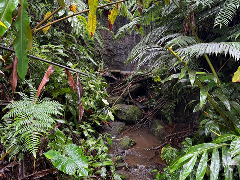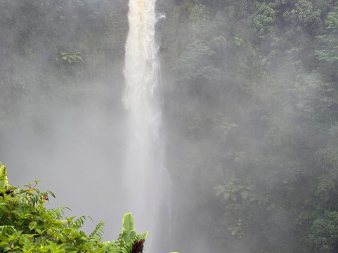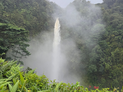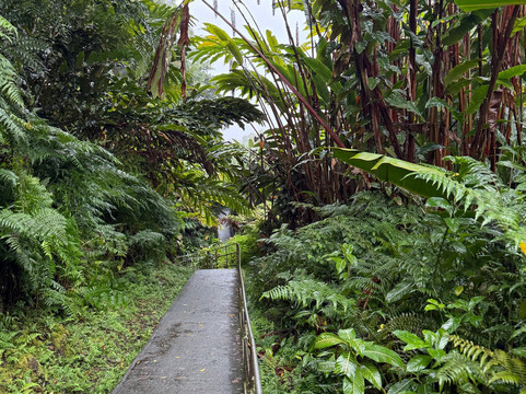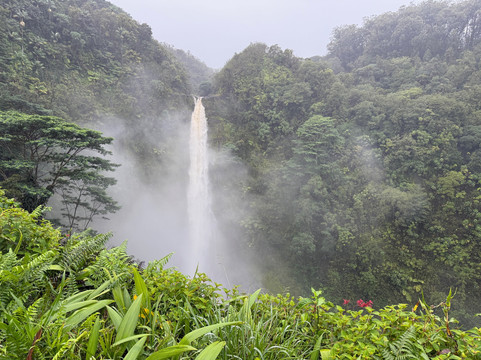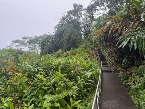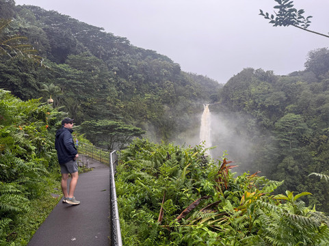 由于下雨,游客不多。公园免费,但停车需要支付少量费用。公园距离主干道只有很短的距离;不过,途中需要穿过一片居民区,拐几个弯。尽管如此,整个行程还是相当轻松的。到达目的地后,沿着丛林小路走一小段路,就能到达一个可以俯瞰瀑布的绝佳观景点。我们去的那天,照片里可以看到瀑布和河谷是多么郁郁葱葱、湿润潮湿。夏威夷以瀑布闻名,我们有幸参观了其中三个。这个瀑布是最高、最壮观的。