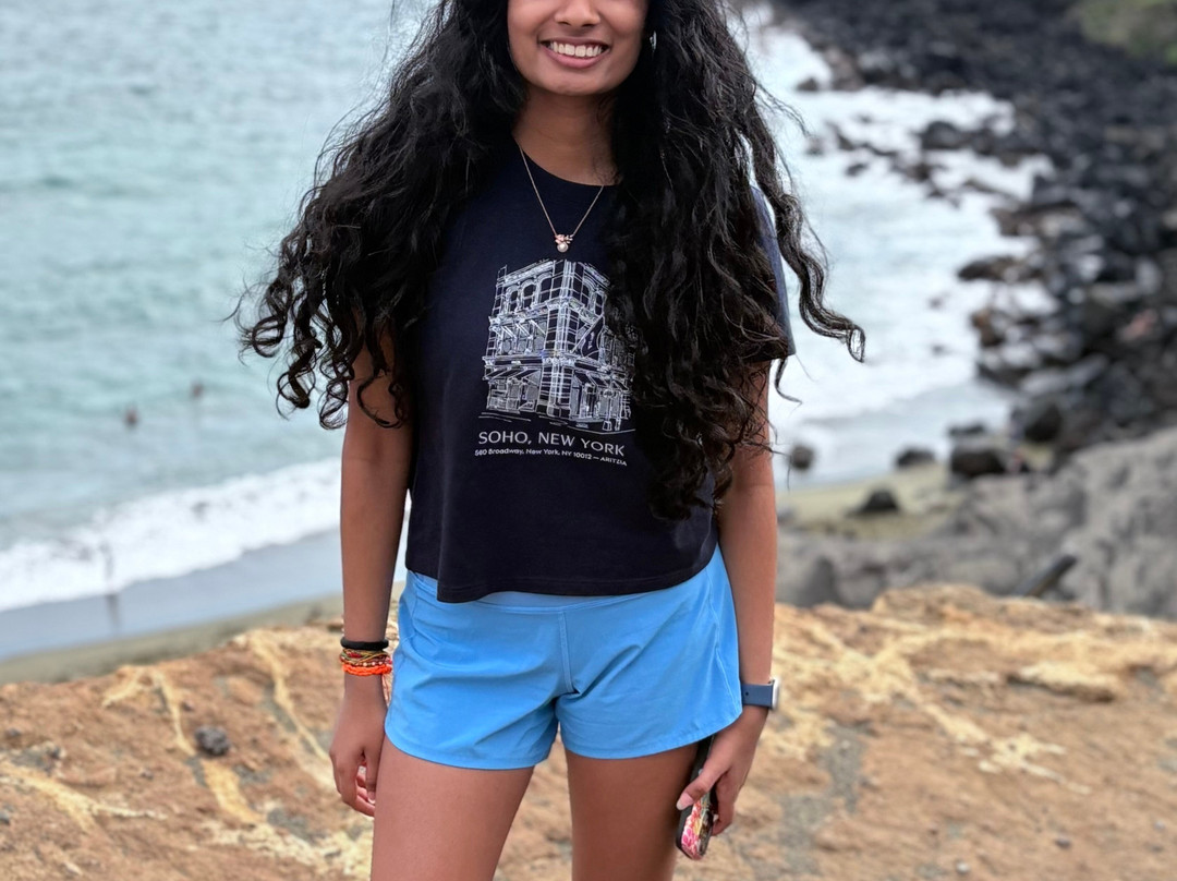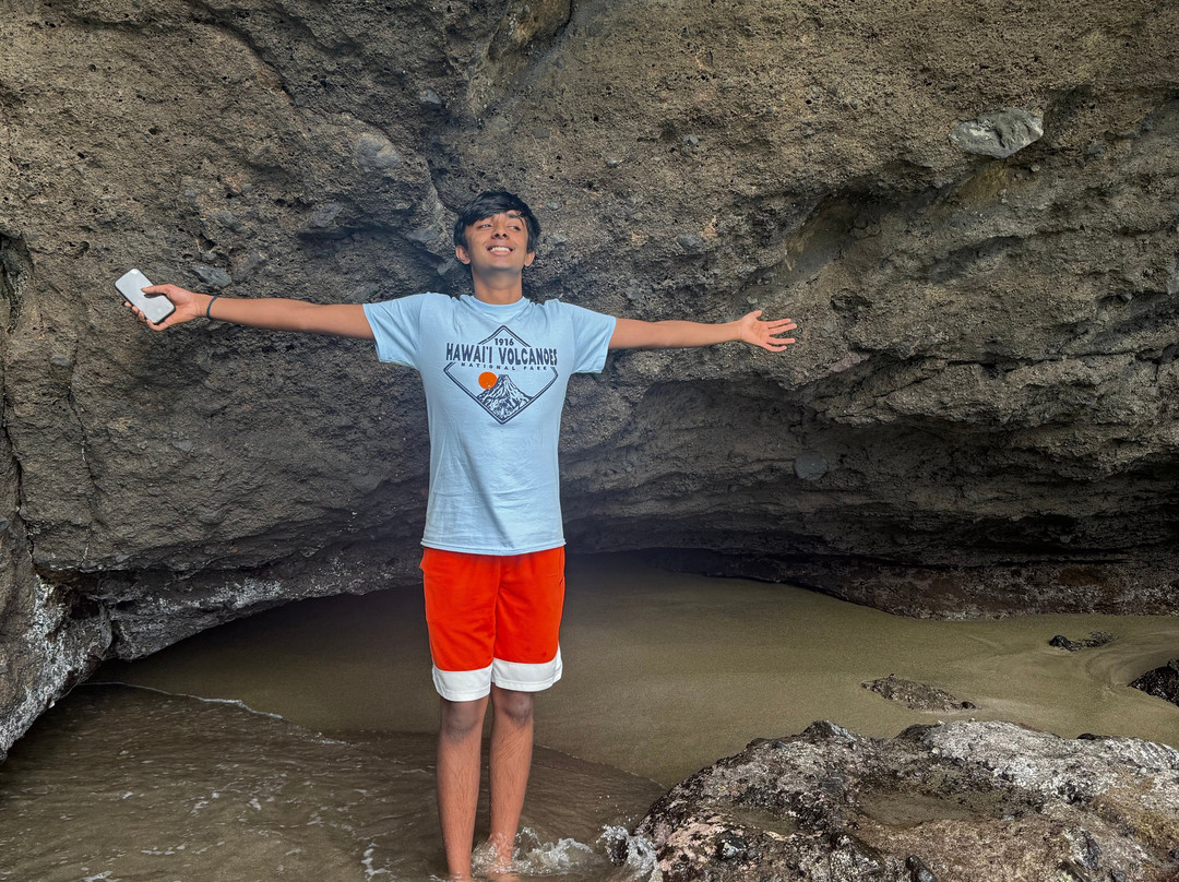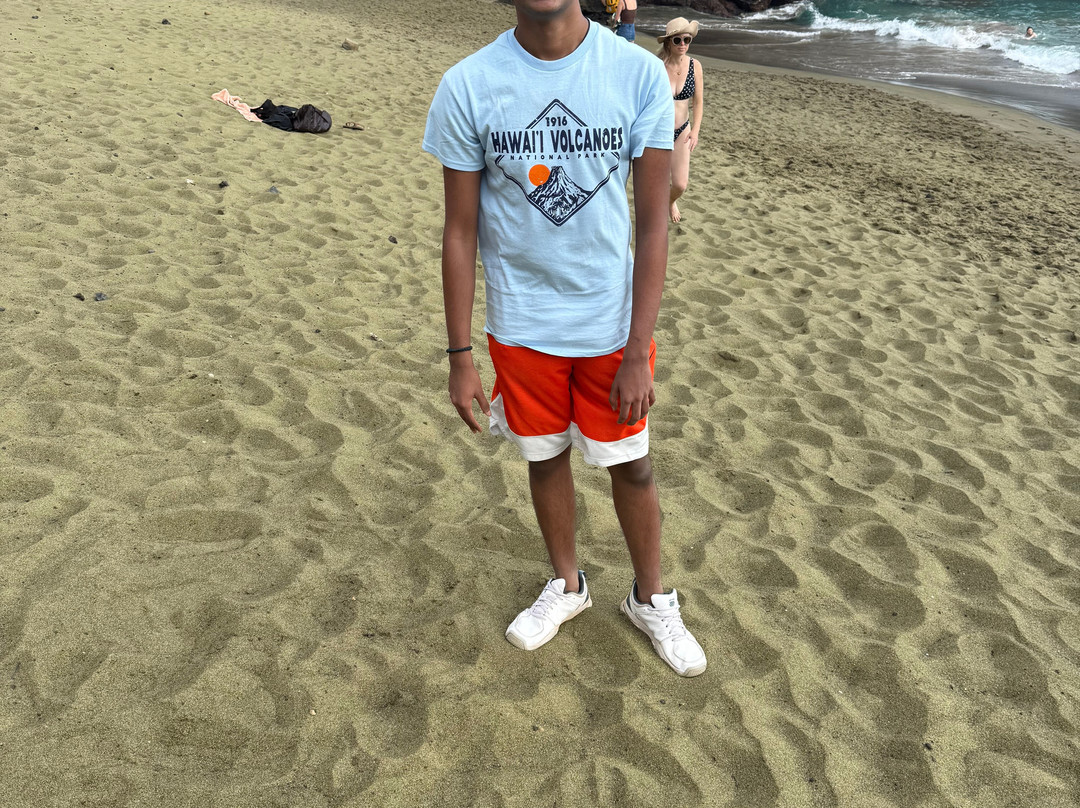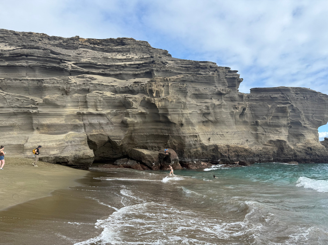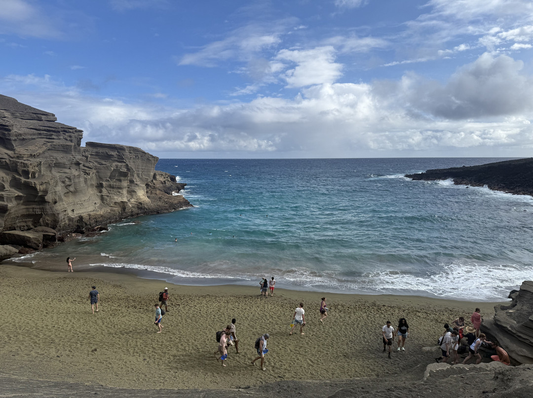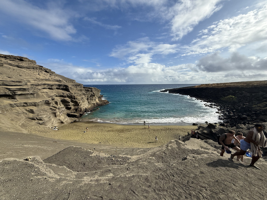 点评:Stunning beach which is a must see if you have enough time in the Big Island. The Green Sands beach is about 90 minutes’ drive from Kona. Once you get there, you are right by the ocean but not quite on the green sands beach. To get there you must either trek 2.5 miles one way or hitch a ride on one of the trucks which costs about 25$ per person round trip. The truck will only wait about one hour for you while you enjoy the beach. If the weather is hot and sultry like in summer, the truck is not a bad option but if the weather is like what it was when we visited in December 2025, the trek is better. The sun bears down on you when you walk so be mindful about being clothed appropriately and using sunscreen. The winds are amazing. Most of the trees in the vicinity are bent northwards due to the force of the winds. You will need to be prepared to get all dusty especially if you do the trek. The trek itself is not difficult, but the ground is uneven and rocky. You also need plenty of time to visit this beach – around 5-6 hours including the drive time from Kona. One needs to climb down some rickety stairs and some sandy sheets of rock to get to the beach and that can be challenging for people with some physical limitations.