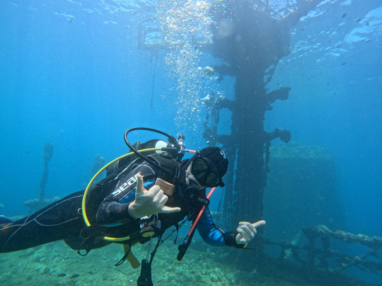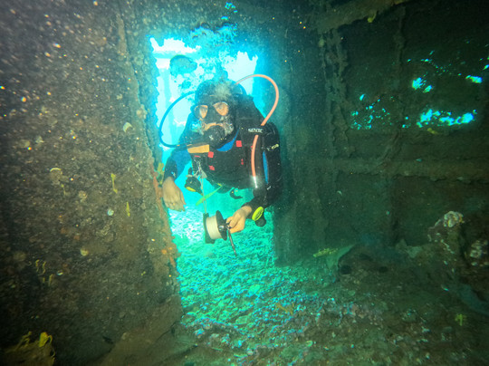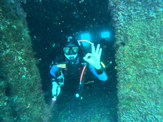 潜水地点?简直太棒了:一艘2000年沉没的货船,长度接近两个足球场,静静地躺在一个可以从头到尾探索的海床上,深度从0米到30米不等。它状况极佳,能见度极佳,而且可以方便地进入船舱和走廊,非常适合进行训练和探索。