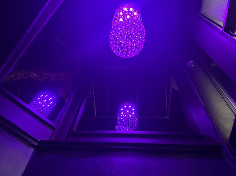 灯光很漂亮,有点像紫蓝色。而且,正如你所见,我们还拍了一些灯具的照片。我上传了一些视频,但都没有拍到入口的景色。你得自己去探索才能进去。