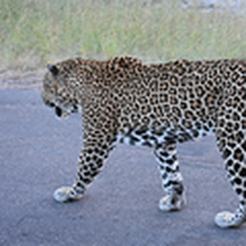 On the 2 hour evening drive we saw a large female white rhino that practically grazed our front bumper and, under 3 km from camp and 10 minutes until gate closing, a large male leopard walking nonchalantly down the middle of the road, paying no attention to us at all and close enough to stroke (and be bitten) 1 m from the driver's door.