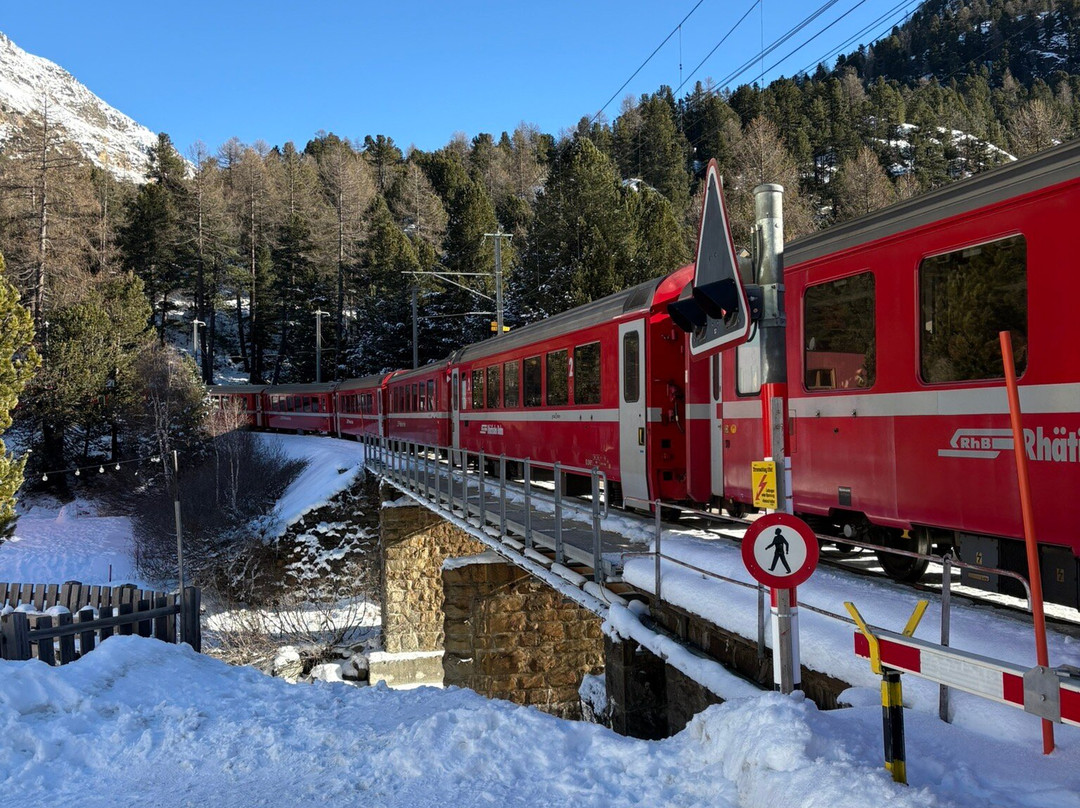 几个小时后,我们搭乘中午十二点四十八分的火车返回,正好赶上莫尔特拉奇站,从那里可以开始徒步前往冰川前缘。路边的指示牌标示着冰川多年来的退缩情况,并用多种语言解释了一些有趣的细节。这段路程大约需要一个小时,坡度适中(不过最好穿登山鞋)。下山的路程又花了四十分钟,正好赶上3点13分的火车,这趟火车下午5点到达蒂拉诺,那时天还没黑。车厢里不算太拥挤,总的来说,这是一次非常愉快的旅程。