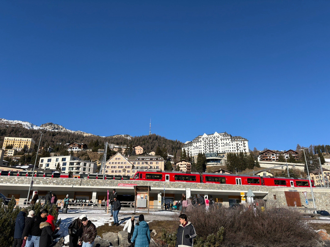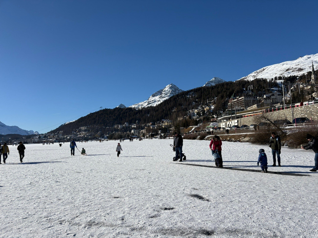 到达圣莫里茨时,太阳还在山后,天气非常寒冷。冰封的湖面真是个散步的好地方!