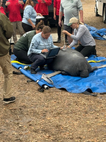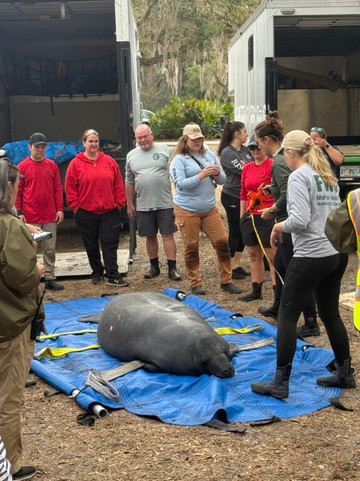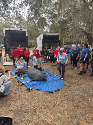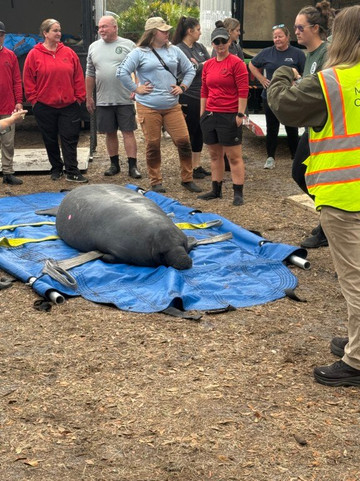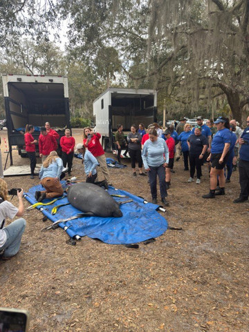 我们很幸运,海洋世界海牛救援队和所有当地电视台都在这里,把康复的海牛放生到泉水中。这些海牛幼年时受过伤,后来在海洋世界、迪士尼乐园以及全国各地的众多动物园接受康复治疗。整个康复过程非常有趣,甚至令人兴奋。