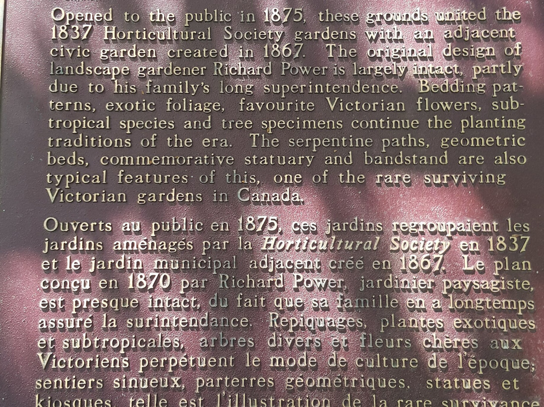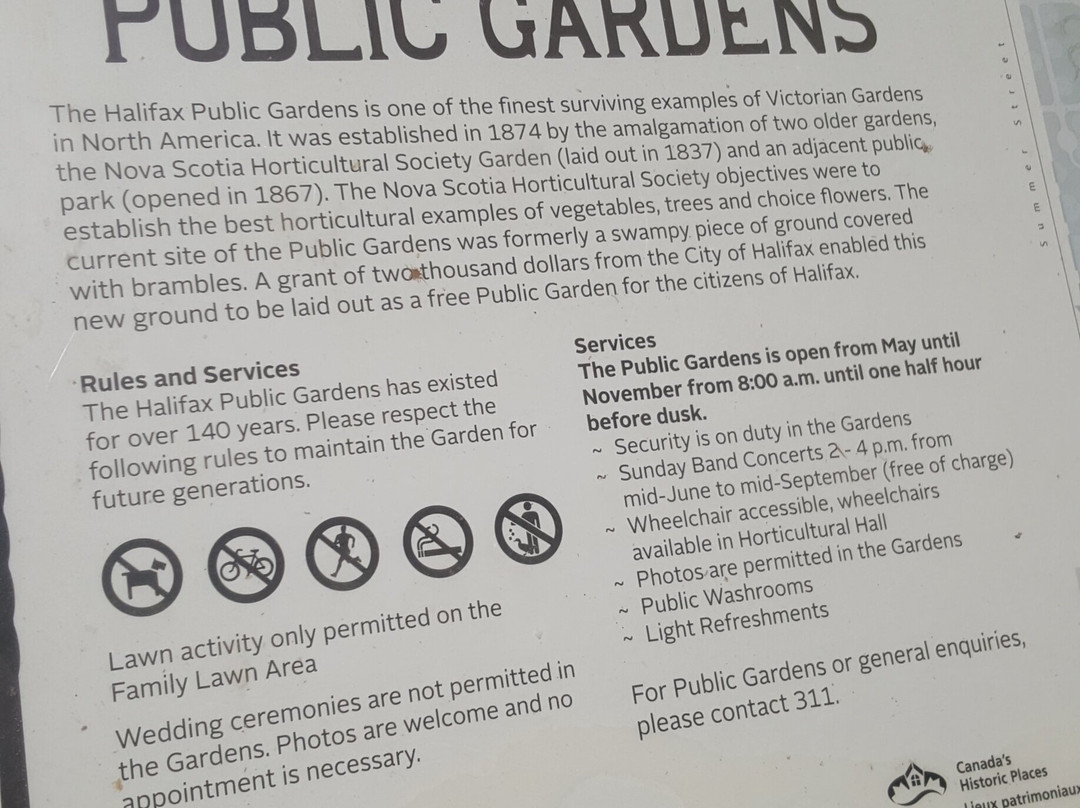翻译:公共花园是一个全年开放、令人流连忘返的好去处。这座花园免费开放,资金来自税款和慷慨的捐赠者。它位于哈利法克斯市中心,交通便利,驾车、乘坐公交车或步行均可轻松抵达。许多游轮的随上随下观光服务也包含这里。一个名为“公共花园之友”的志愿者团体协助市公园和绿地部门开展工作,组织各种活动、导览和设置指示牌。夏季,历史悠久的园艺大厅提供餐饮服务。建于1887年的露天音乐台是夏季周日音乐会的举办地。园内种植了许多植物,并设有纪念牌匾,以纪念皇室活动和到访者。圣诞节期间,花园会增添灯光,点亮夜晚。